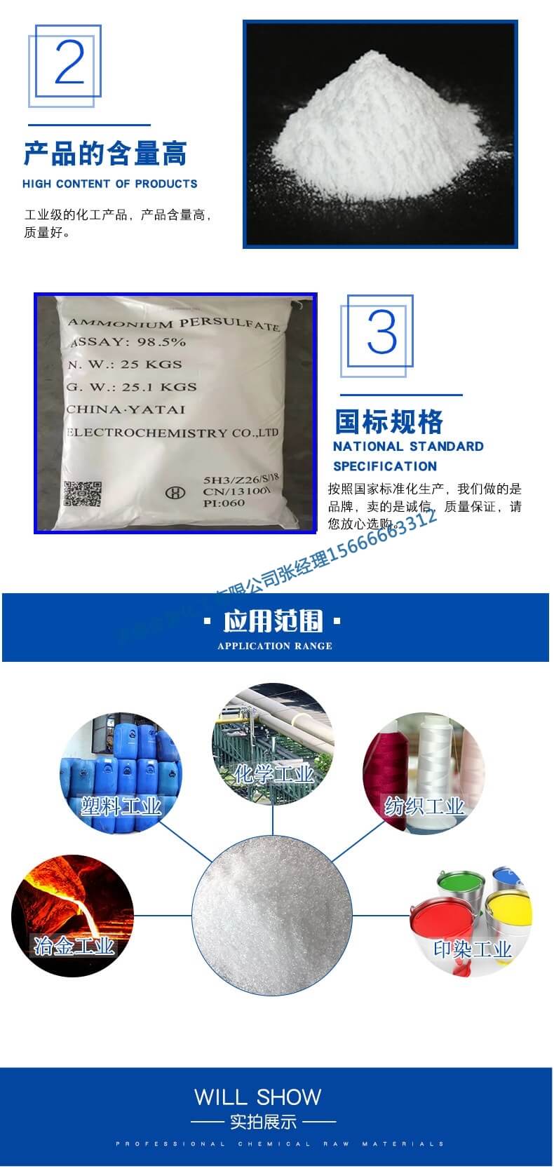 檢定和測定錳,用作氧化劑。漂白劑。照相還原劑和阻滯劑。電池去極劑。用于可溶性淀粉的制備;用作醋酸乙烯、丙烯酸酯等烯類單體乳液聚合的引發(fā)劑,便宜,所得乳液耐水性較好;還用作脲醛樹脂的固化劑,固化速度快;亦用作淀粉膠黏劑的助氧化劑,與淀粉成分中的蛋白質(zhì)反應(yīng)提高粘接性,參考用量為淀粉的0.2%~0.4%;也用作金屬銅表面處理劑。用作制造過硫酸鹽和雙氧水的原料;還用于金屬板蝕割時(shí)的腐蝕劑及石油工業(yè)采油;食品級用作小麥改質(zhì)劑、啤酒酵母防霉劑。